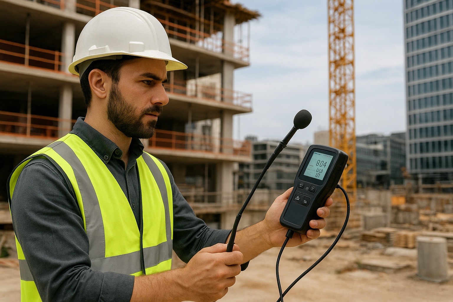 Engineer conducting real-time air quality testing at an active green building construction site.