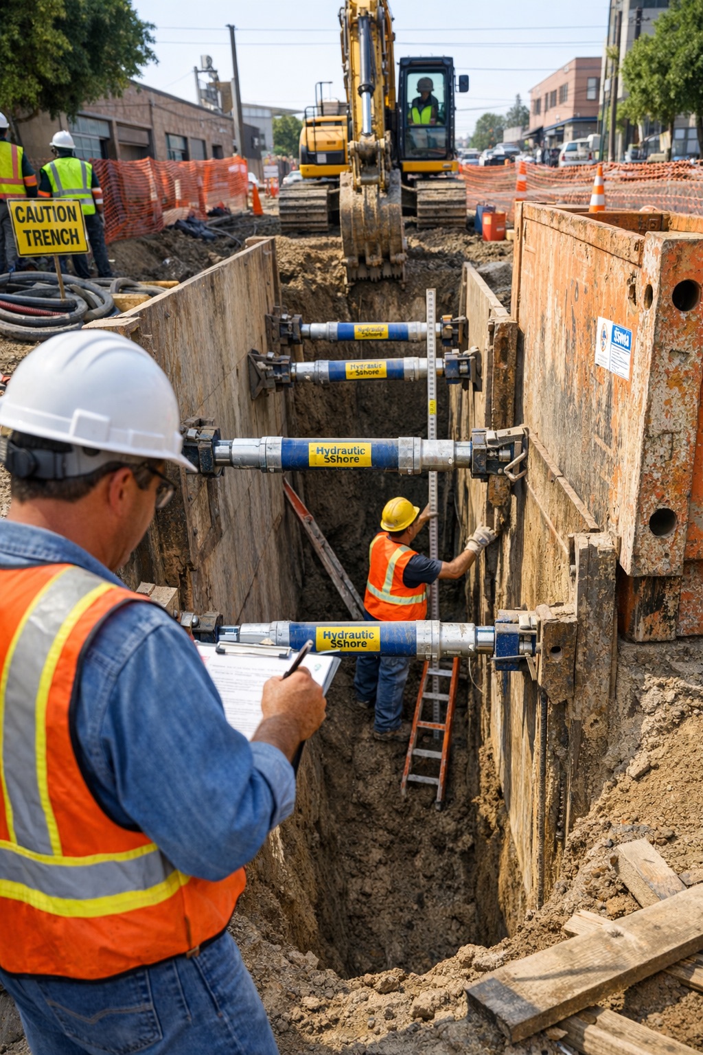 Hydraulic trench shoring system installed and inspected at a construction site to prevent soil collapse and meet OSHA trench safety requirements.